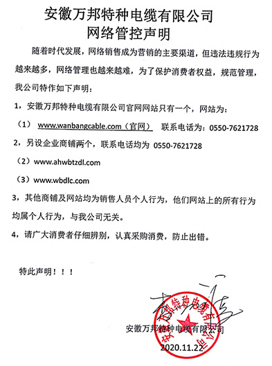 鄭重聲明:安徽萬邦特種電纜有限公司官方網站為:www_wanbangcable_com.glslxsxh.com,除此之外無任何子網站或合作網站,其余均為假冒偽劣。電話:0550-7621728 13485756353 地 址:安徽省天長市滁州高新技術產業開發區經四路29號